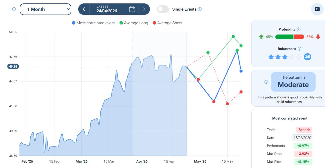 Il tool “Pattern” della piattaforma Forecaster, con orizzonte temporale a 1 mese, evidenzia nello scenario long (linea verde) un iniziale storno verso area 45 dollari, seguito da un possibile rialzo verso zona 49,50 dollari.