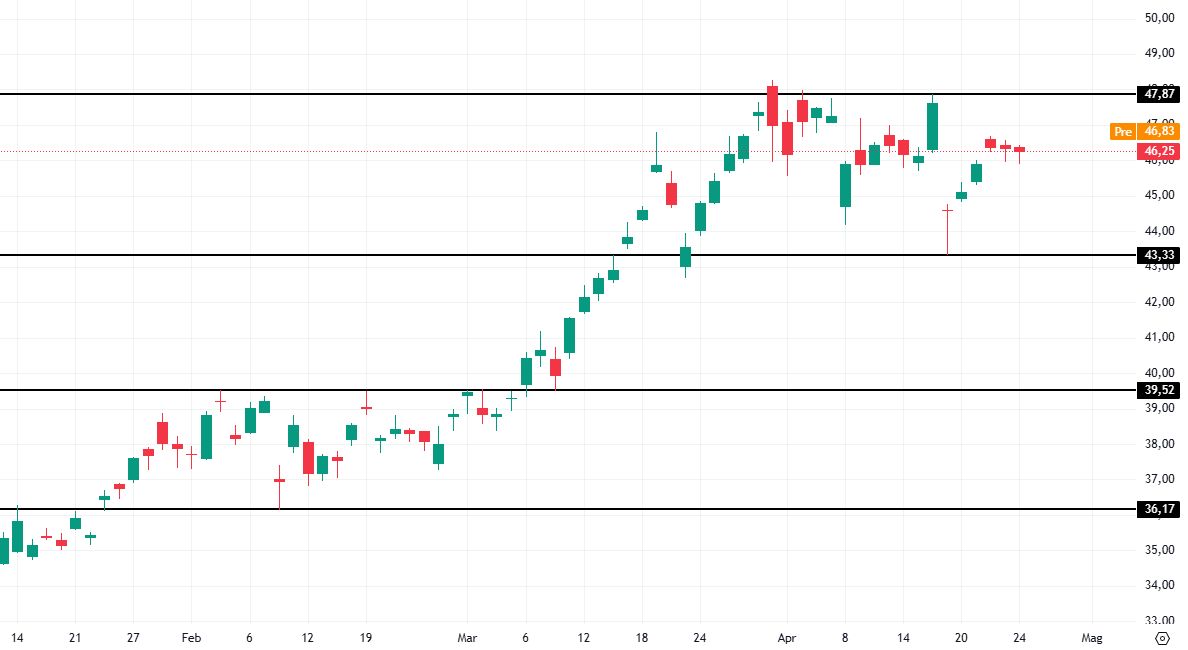 Le azioni BP (ADR) rimangono all’interno della struttura laterale in atto dal 20 marzo, che vede come supporto area 43 dollari e come resistenza area 48 dollari. Guardando l’andamento di più lungo periodo, la tendenza è rialzista dai minimi segnati ad aprile 2025 in area 25 dollari, favorendo l’implementazione di strategie long.