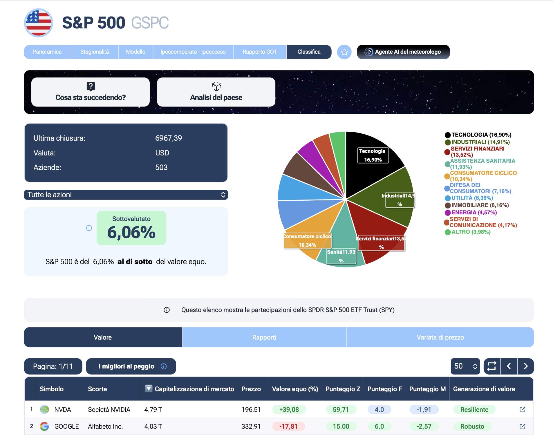 Spostando l'attenzione sulla sezione ranking del Forecaster, l'S&P 500 mostrava un quadro altrettanto inequivocabile. Dopo un piccolo ritracciamento dai massimi storici, quantificabile in un calo fisiologico di circa l'8%, l'indice è entrato in una palese area di sconto.