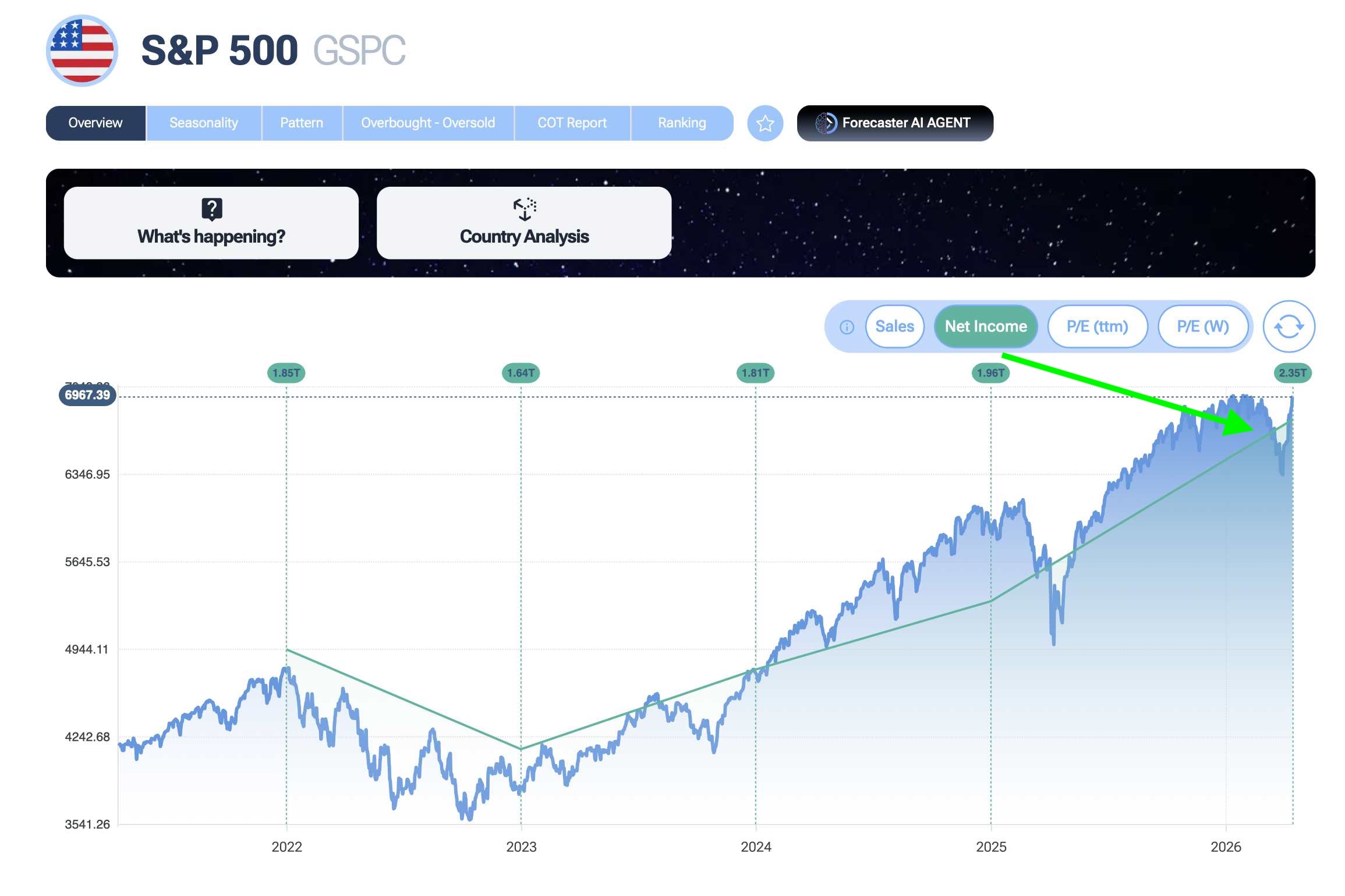 Forecaster offre la possibilità, molto intuitiva e immediata, di sovrapporre gli utili generati da tutti i componenti dell'S&P 500 direttamente sul grafico delle quotazioni. Empiricamente, è facile notare come l'andamento dei prezzi sia correlato positivamente con quello degli utili: le Borse tendono a salire quando le aziende macinano profitti. Storicamente, tutte le volte che i prezzi sono crollati al di sotto della linea degli utili - pur trattandosi di due scale valoriali diverse quindi si parla appunto di prove empiriche e non fondate matematicamente - si è sempre venuta a creare una straordinaria finestra per gli acquisti. La paura della guerra aveva schiacciato le quotazioni, ma i fondamentali delle aziende continuavano a rimanere solidissimi.