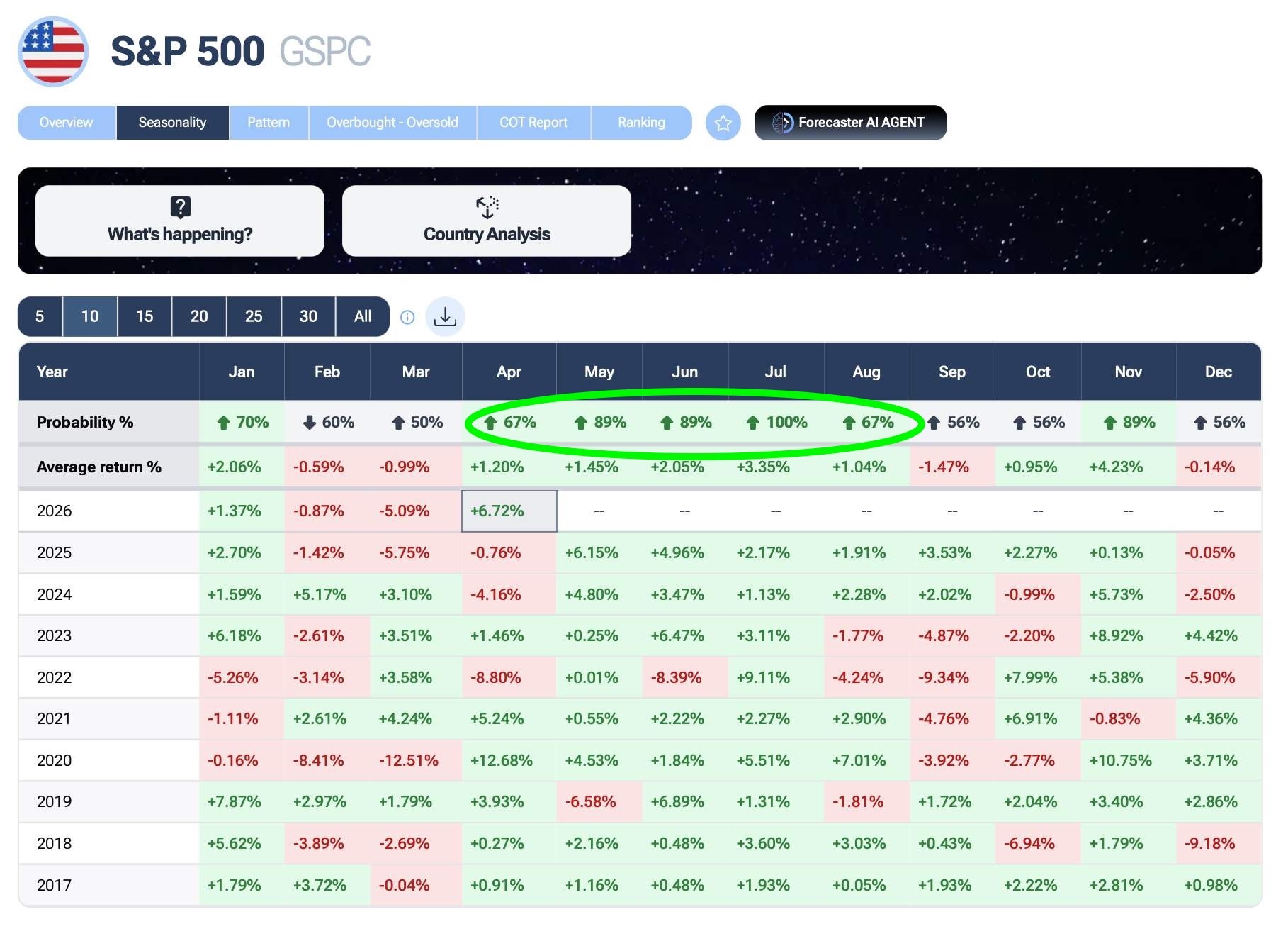Infine, abbiamo aggiunto il tassello del tempo. La sezione stagionalità di Forecaster ci ricordava che, proprio in quei giorni di paura, stavamo entrando in una delle finestre temporali più propizie in assoluto per il mercato azionario.