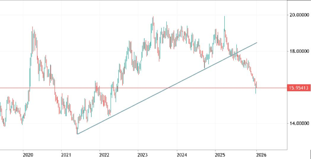 Violare al ribasso questa zona di prezzo psicologica ci porterebbe a 4,7, zona di minimi del 2022 e del 2023. Sotto 4,7 non ci sarebbero molti dubbi su quale preferenza dare al Real in una ideale asset allocation valutaria che assieme al Rand favorirebbe una sempre maggiore esposizione ai bond emergenti.