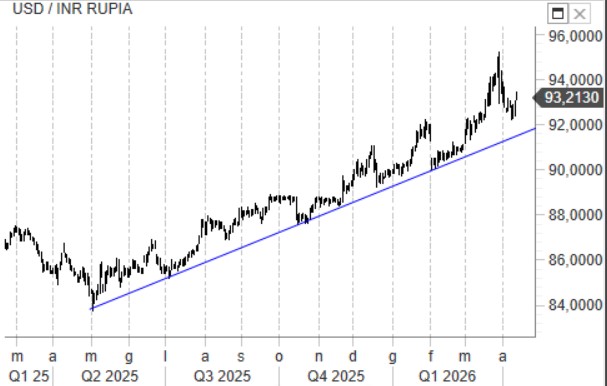 Da un massimo di 95 il cambio USD/INR è scivolato fino a 92 e di nuovo sembra voler puntare quella zona di supporto che oggi si posiziona una figura sopra rispetto al livello di febbraio.