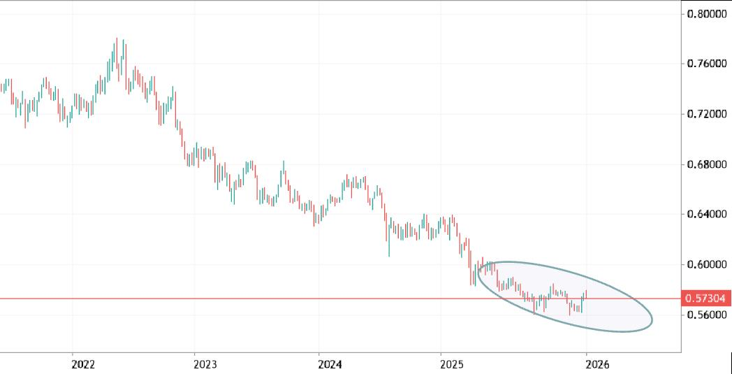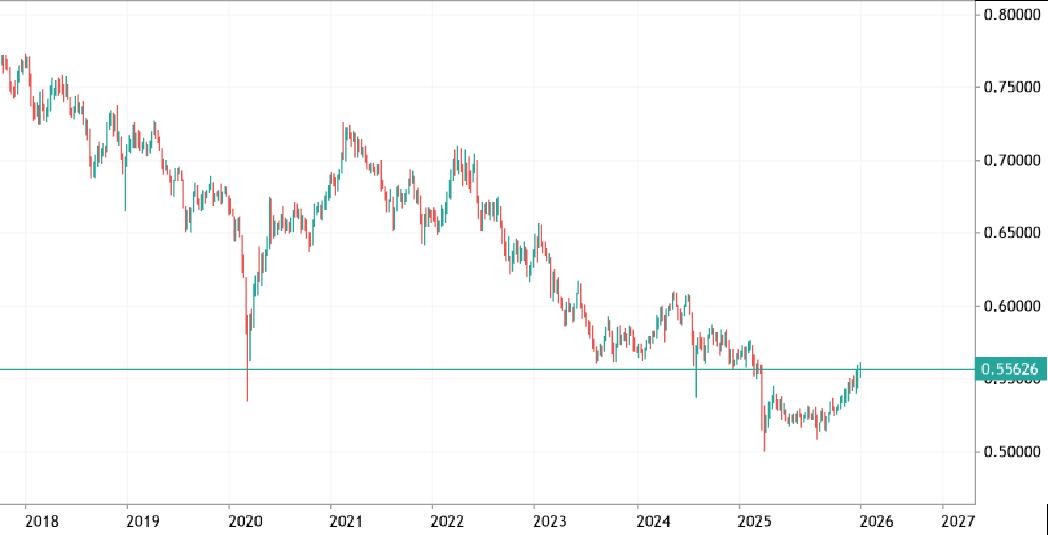 Il minimo dell’australiano è arrivato in corrispondenza con quel Liberation Day di aprile 2025 dal quale è partita una reazione che senza quasi mai girarsi indietro sta ora abbozzando la definitiva inversione di tendenza contro dollaro ed euro. Non è un caso che questa crescita è avvenuta in sintonia con la ripresa delle borse emergenti, cinese in particolare ai cui destini è legato l’export australiano.