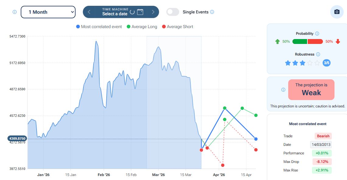 Per quanto riguarda la stagionalità - analizzata con la piattaforma Forecaster - gli archi temporali selezionati mostrano una possibile fase rialzista fino alla fine della prima decade di aprile, seguito da una possibile fase laterale che potrebbe estendersi a fine mesi.