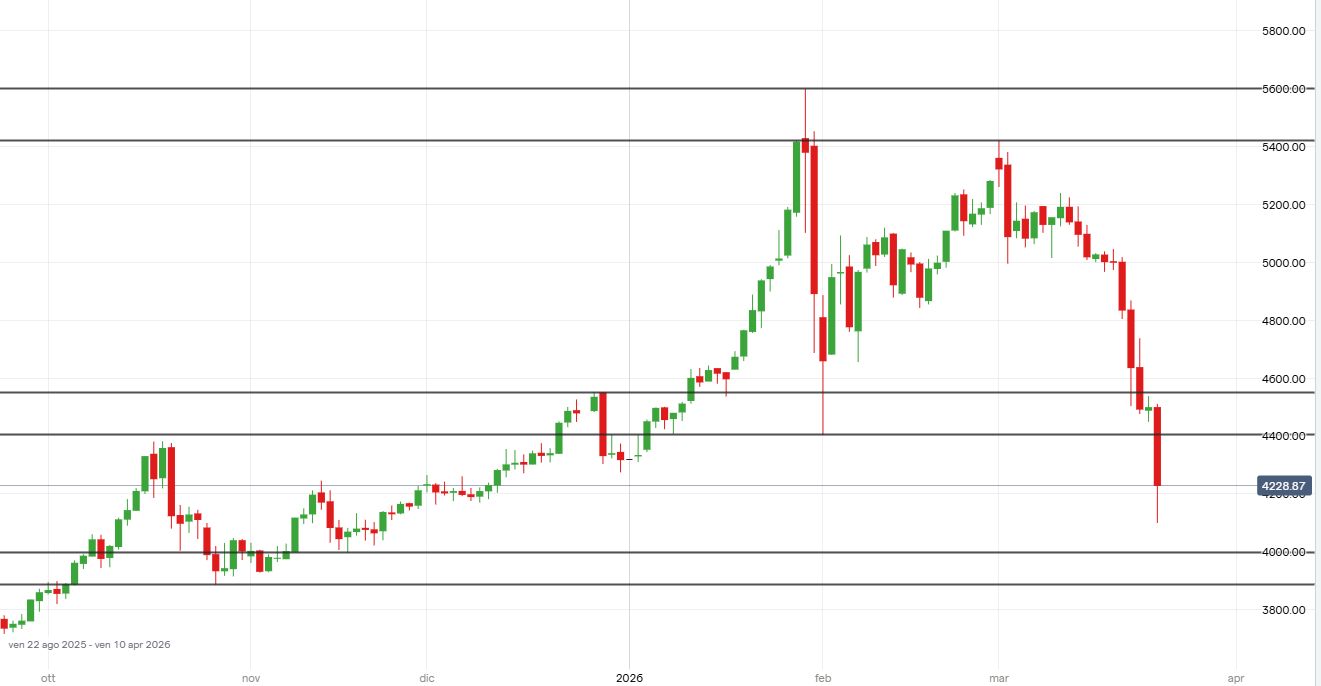 Con le vendite registrate nelle ultime settimane, le quotazioni dell’oro si sono riportate in area di minimi da inizio dicembre scorso, cancellando l’intero guadagno segnato nel 2026. Al momento i prezzi si trovano a metà strada tra l’area di resistenza compresa tra i 4.404 e i 4.550 dollari e la zona di supporto a 4.000 e 3.886 dollari.